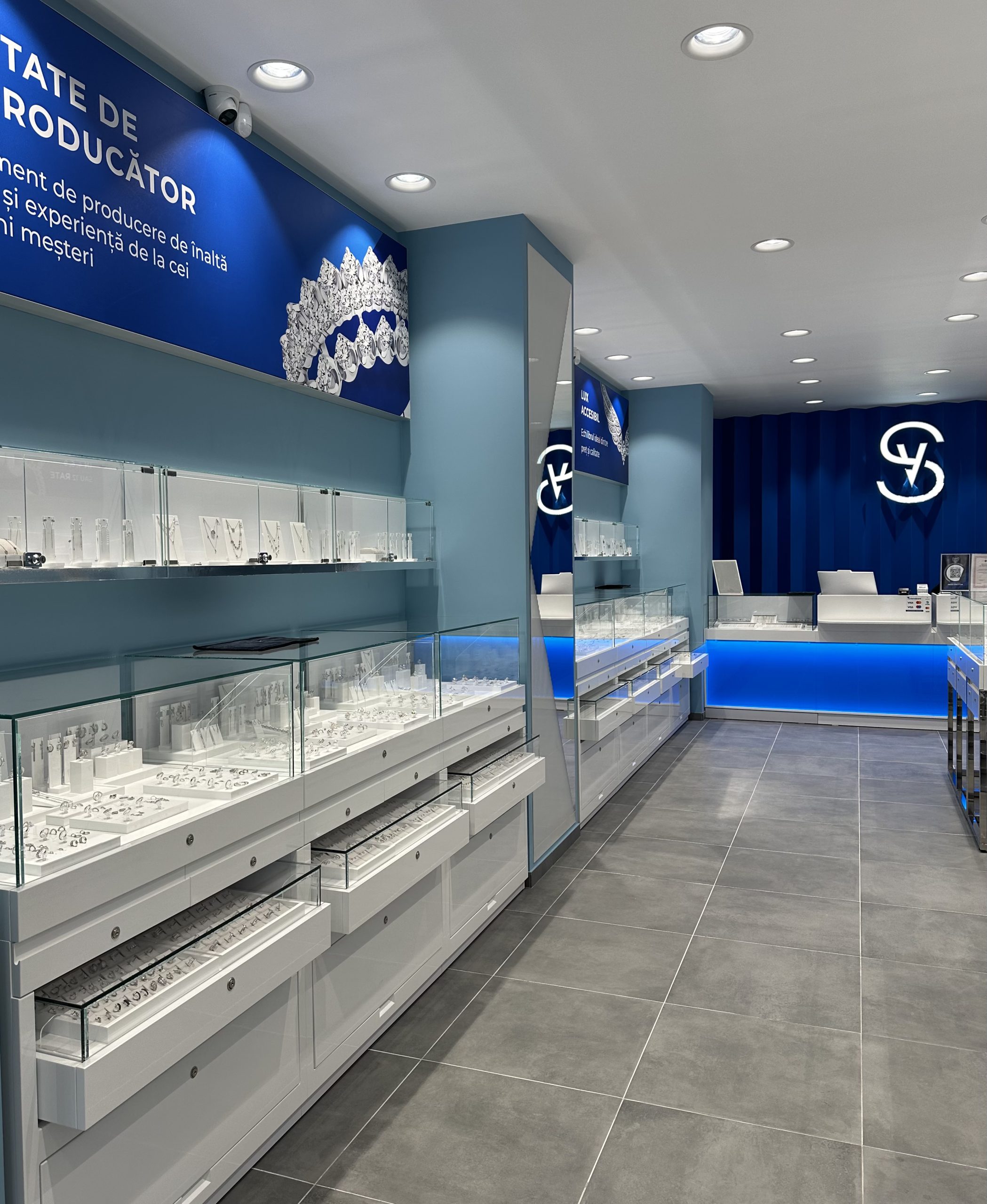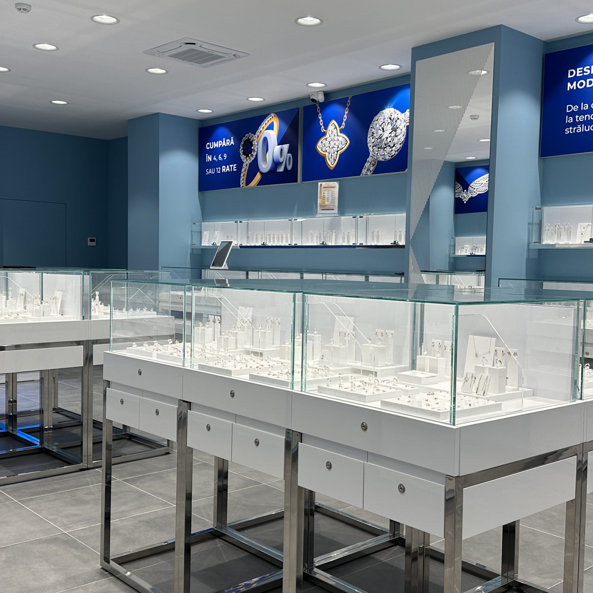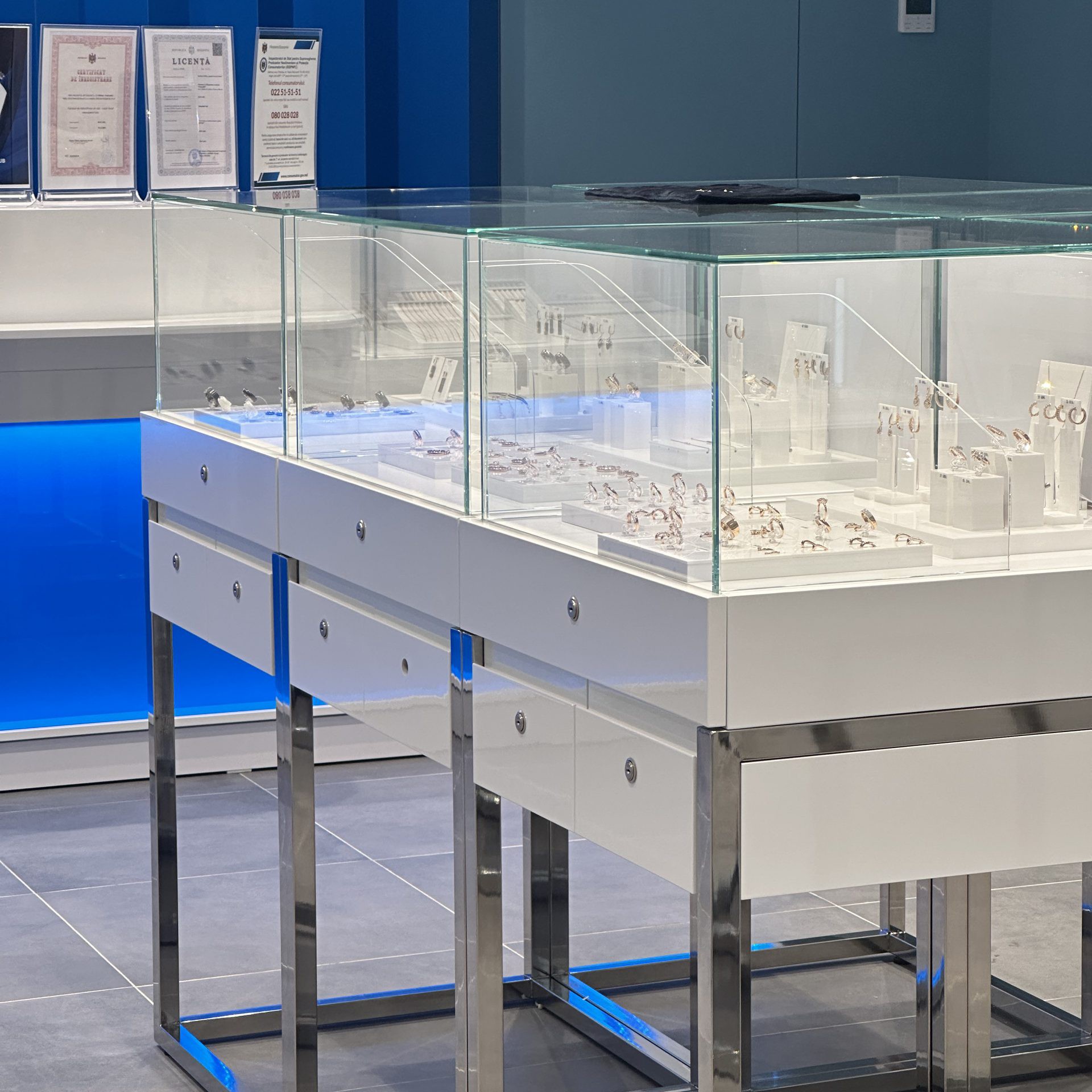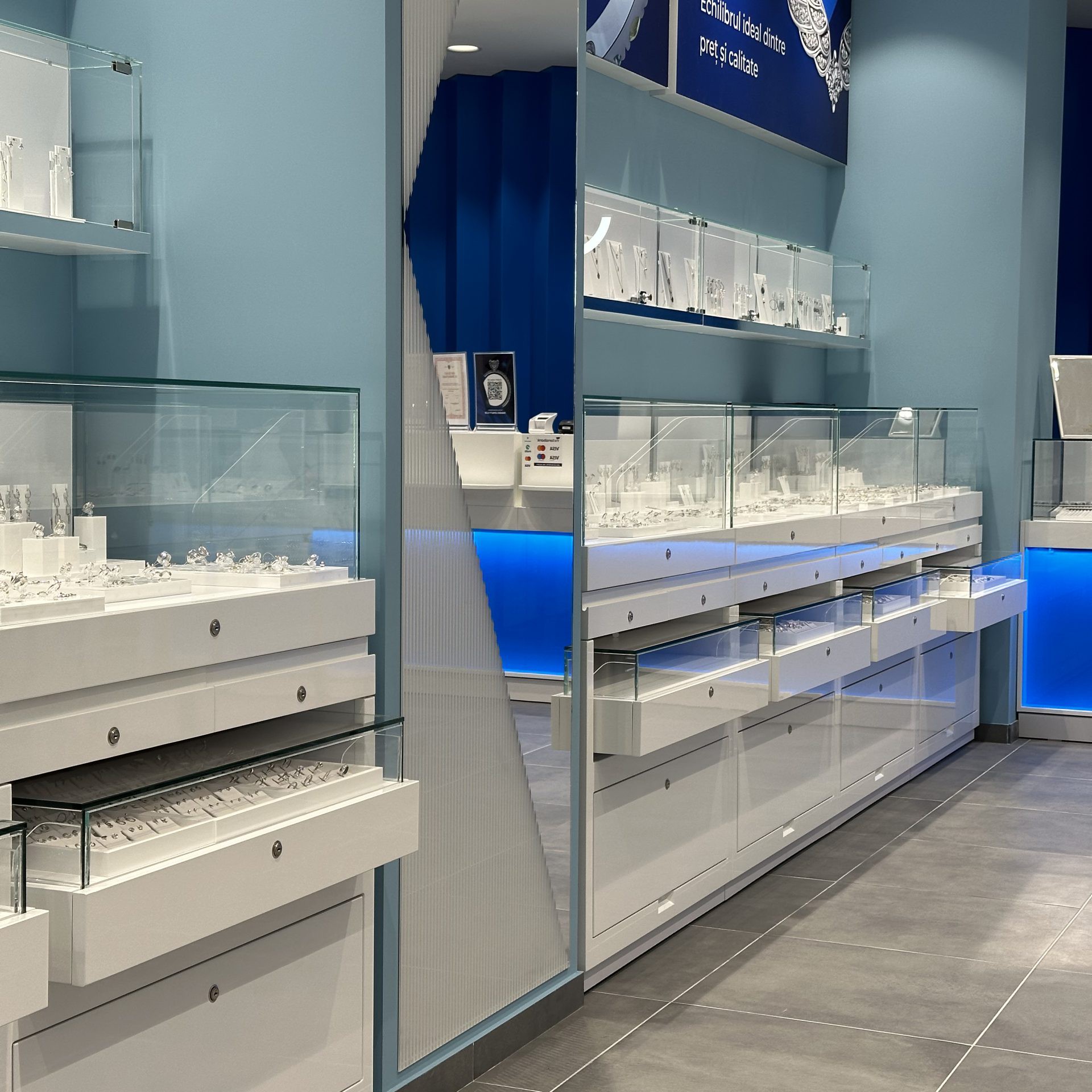 - Vitrine luminoase, dulapuri încăpătoare și sertare cu închidere securizată.
