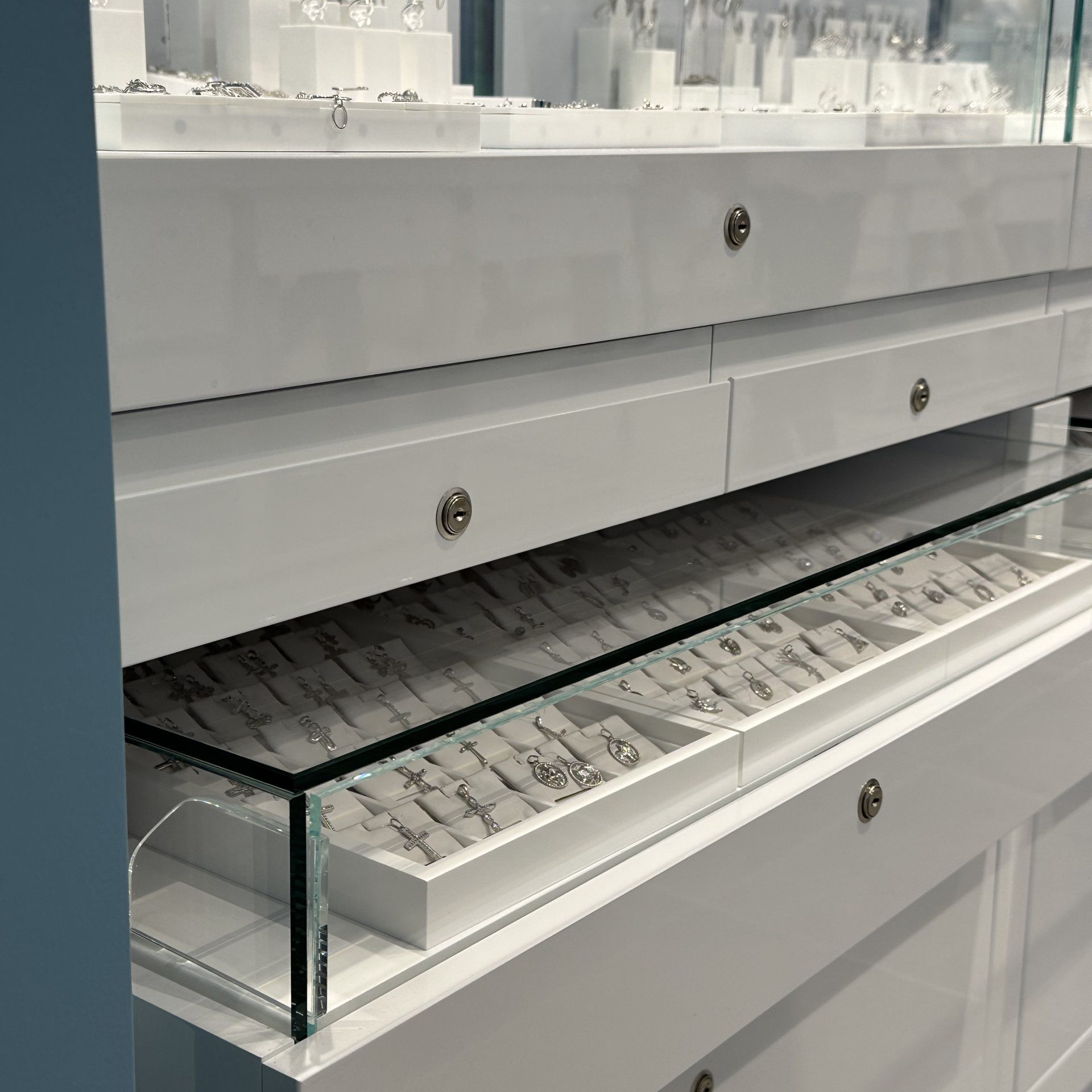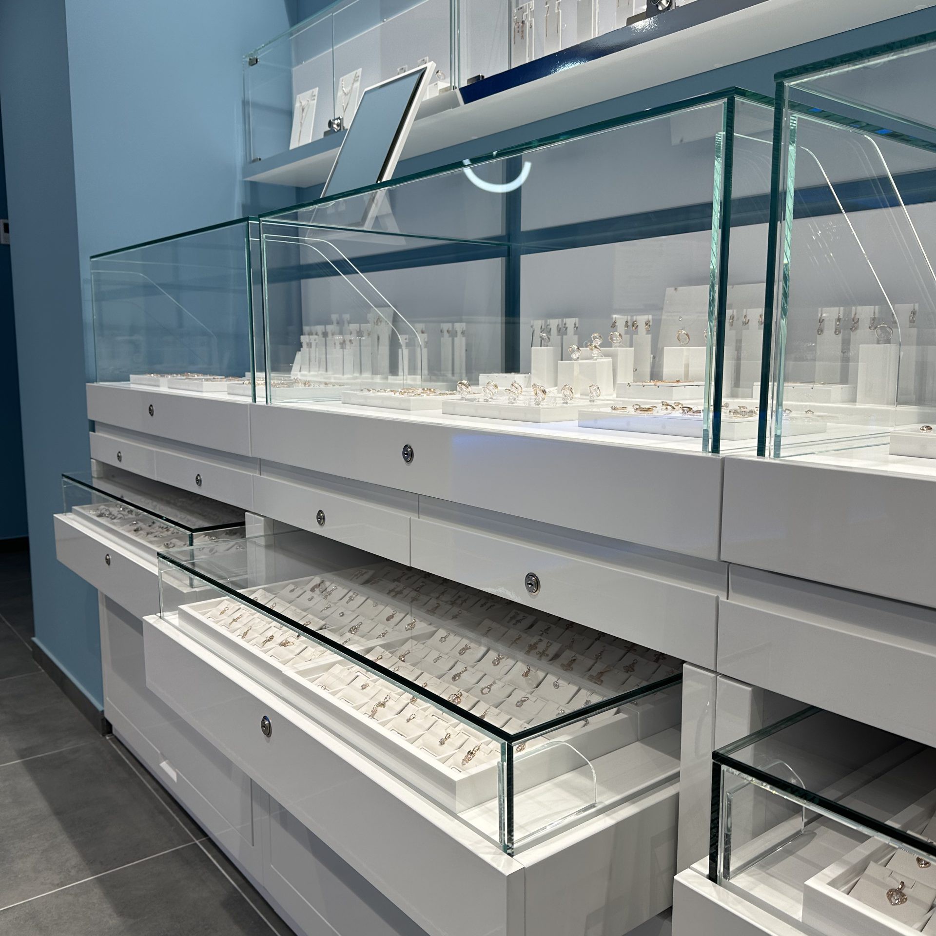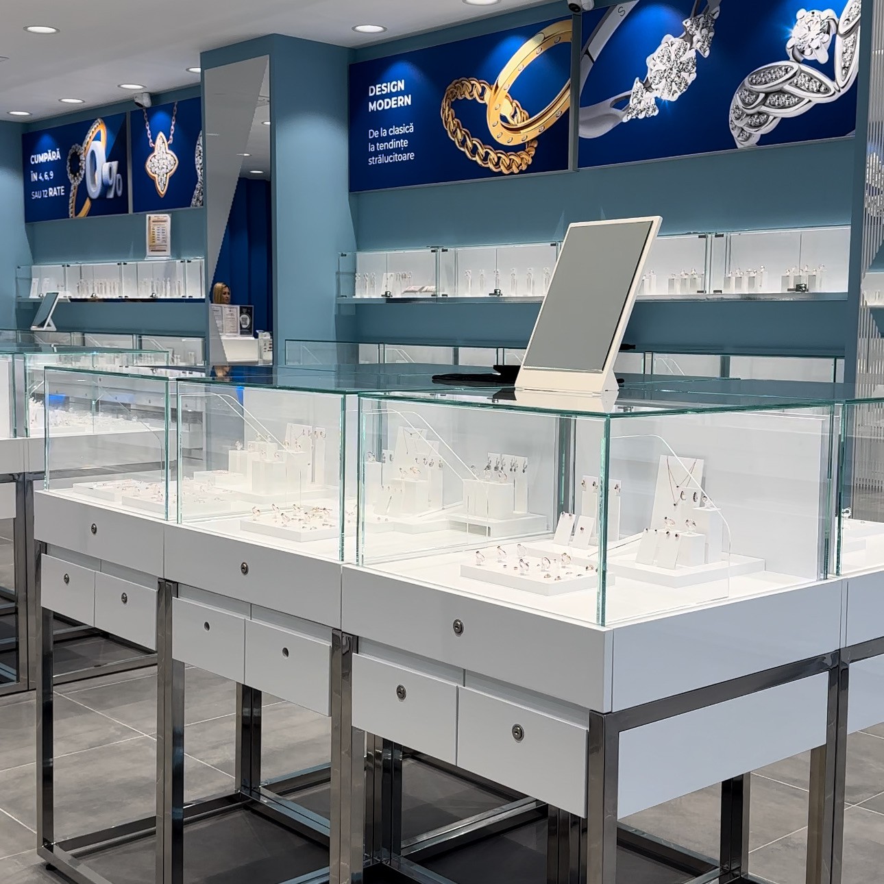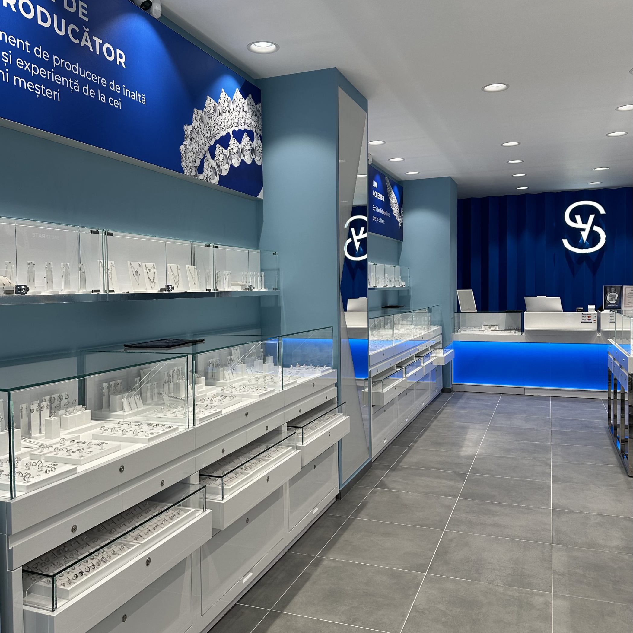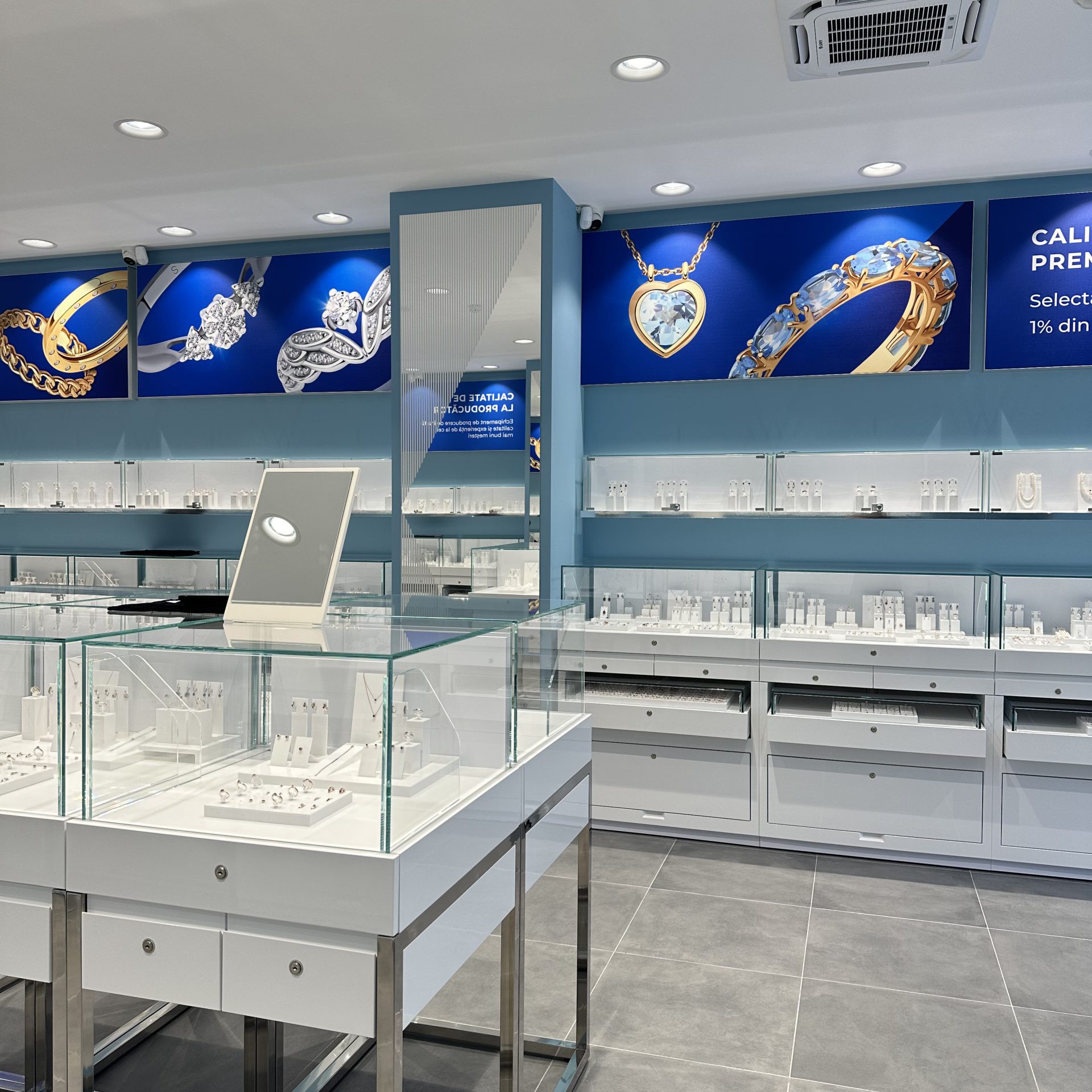 - Vitrine luminoase, dulapuri încăpătoare și sertare cu închidere securizată.